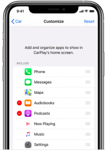 Je kunt de volgorde van de Apps op je scherm ook wijzigen. Ga naar ‘Instellingen, dan ‘Algemeen’ en kies ‘Carplay’. Hier klik je op de betreffende auto en ga je naar ‘Pas aan’. Je kunt met de rode min apps verwijderen, met de groene plus apps toevoegen. Verder verander je de volgorde door ze te verslepen.