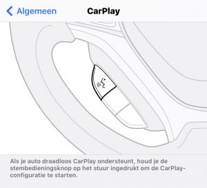 Voor het draadloos koppelen ga je op de iPhone naar ‘Algemeen’ en kies je ‘CarPlay’. Hier zie je de auto’s die beschikbaar zijn. In sommige gevallen kun je de eerste keer alleen via USB koppelen.
