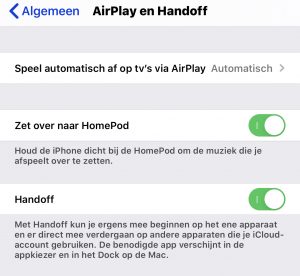 Open de App ‘Instellingen’ en scroll naar ‘Algemeen’. Hier kun je klikken op ‘Airplay en Handoff’. Zet daar het schuifje bij ‘Handoff’ aan.