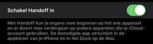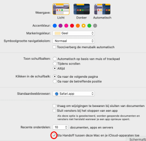 Via ‘Systeemvoorkeuren’ ga je naar ‘Algemeen’. Hier staat onderin de mogelijkheid ‘Sta Handoff tussen deze Mac en je iCloud-apparaten toe’. Deze zet je aan.