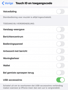 Om dit aan te zetten ga je naar ‘Instellingen’ en kies je ‘Touch ID en toegangscode’, of ‘Face ID en toegangscode’. Hier heb je onderaan de mogelijkheid om USB accessoires alleen te mogen gebruiken bij een ontgrendelde iPhone. Let wel op bij de externe apparaten die je aansluit.