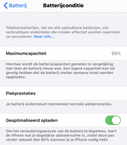 Je kunt zelf de capaciteit van de batterij ook zien. Ga naar ‘Instellingen’ en klik op ‘Batterij’. Hier kies je voor ‘Batterijconditie’. De capaciteit staat in percentage weergegeven. Als deze onder de 80% zit, kan het aan te raden zijn om de batterij te vervangen als je klachten ervaart. Soms ervaar je pas klachten bij een veel lager percentage. Onder de capaciteit lees je of de batterij de piekprestaties nog aan kan.